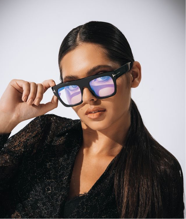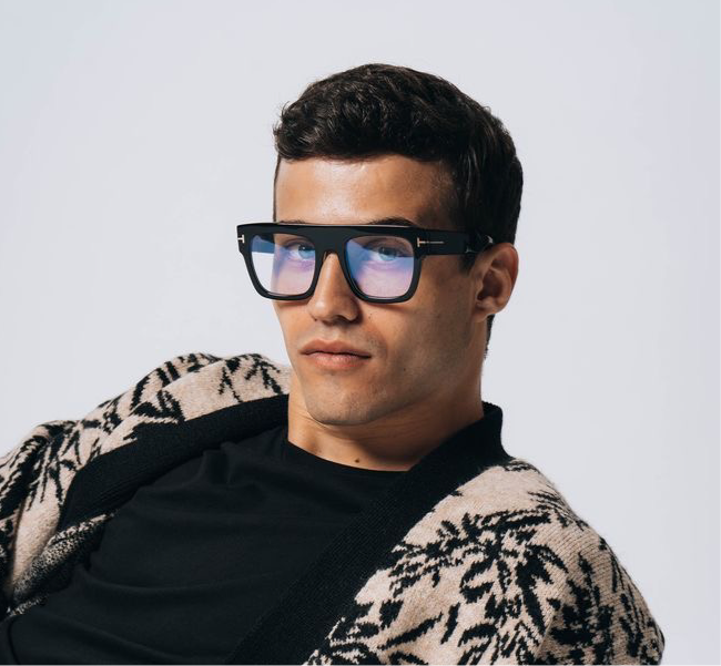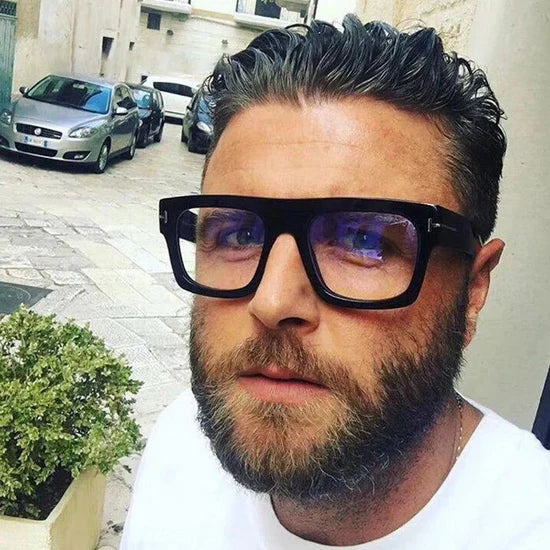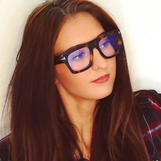 Stylish square-frame glasses with thick rims, clear lenses, and elegant metallic accents, offering a modern and sophisticated touch.