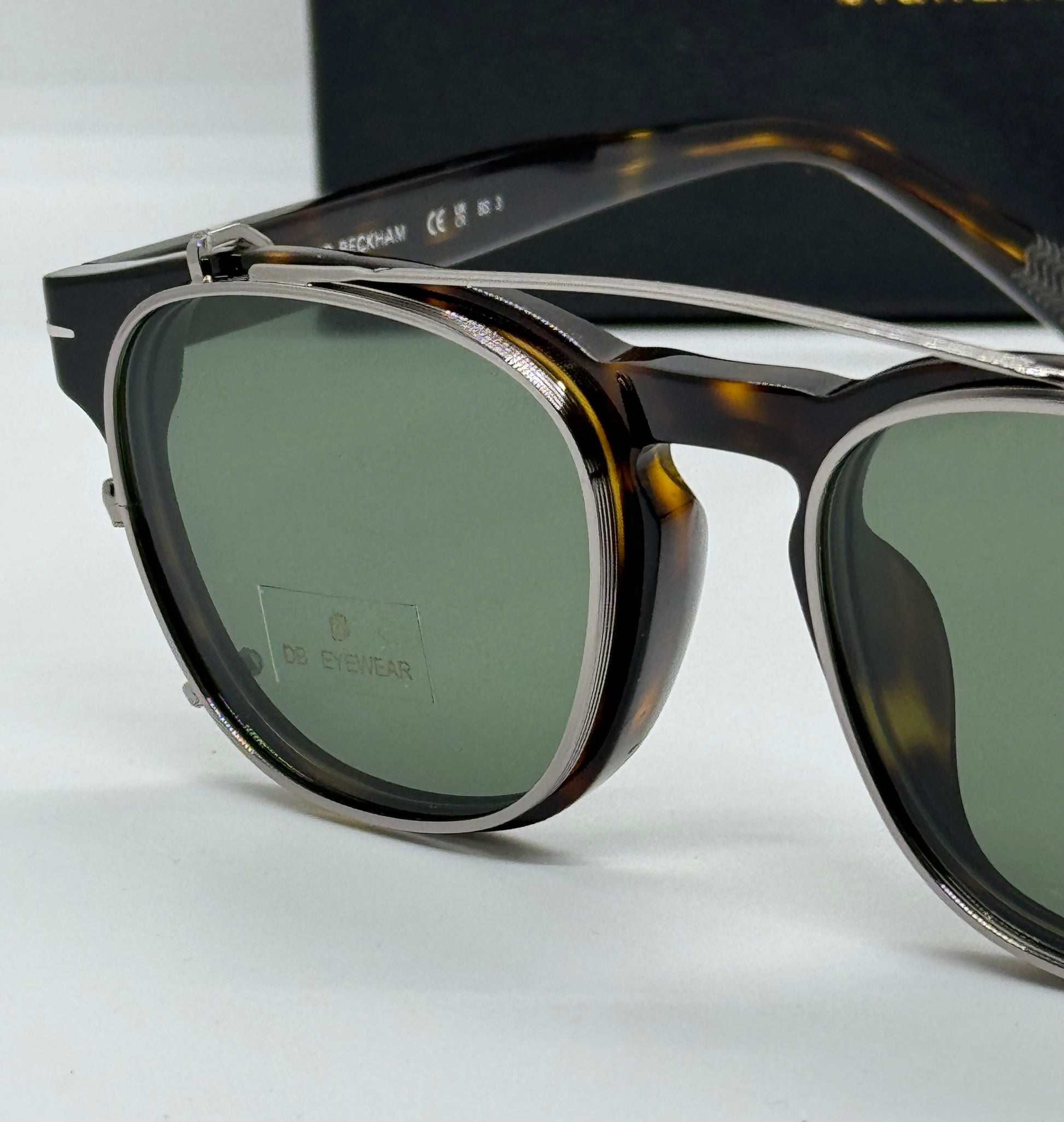 David Beckham DB 1117/CS, a versatile square-frame design that functions as both optical eyeglasses and sunglasses via a detachable clip-on lens.
