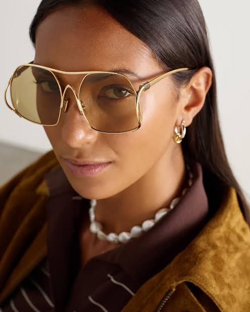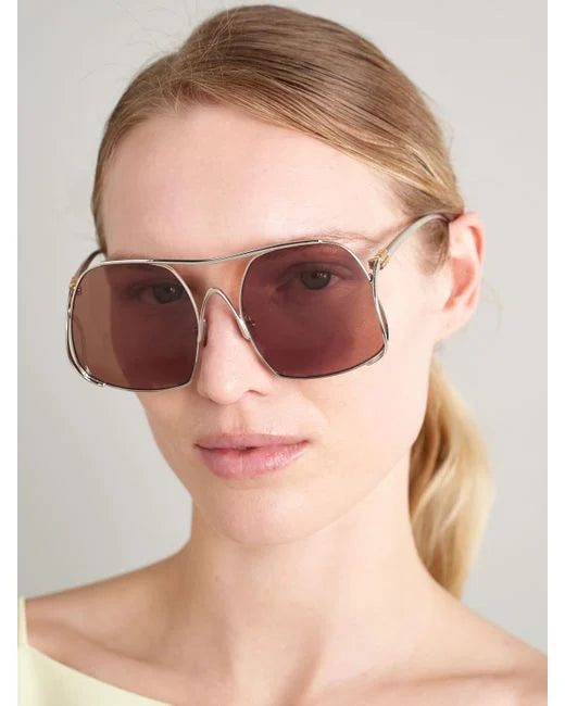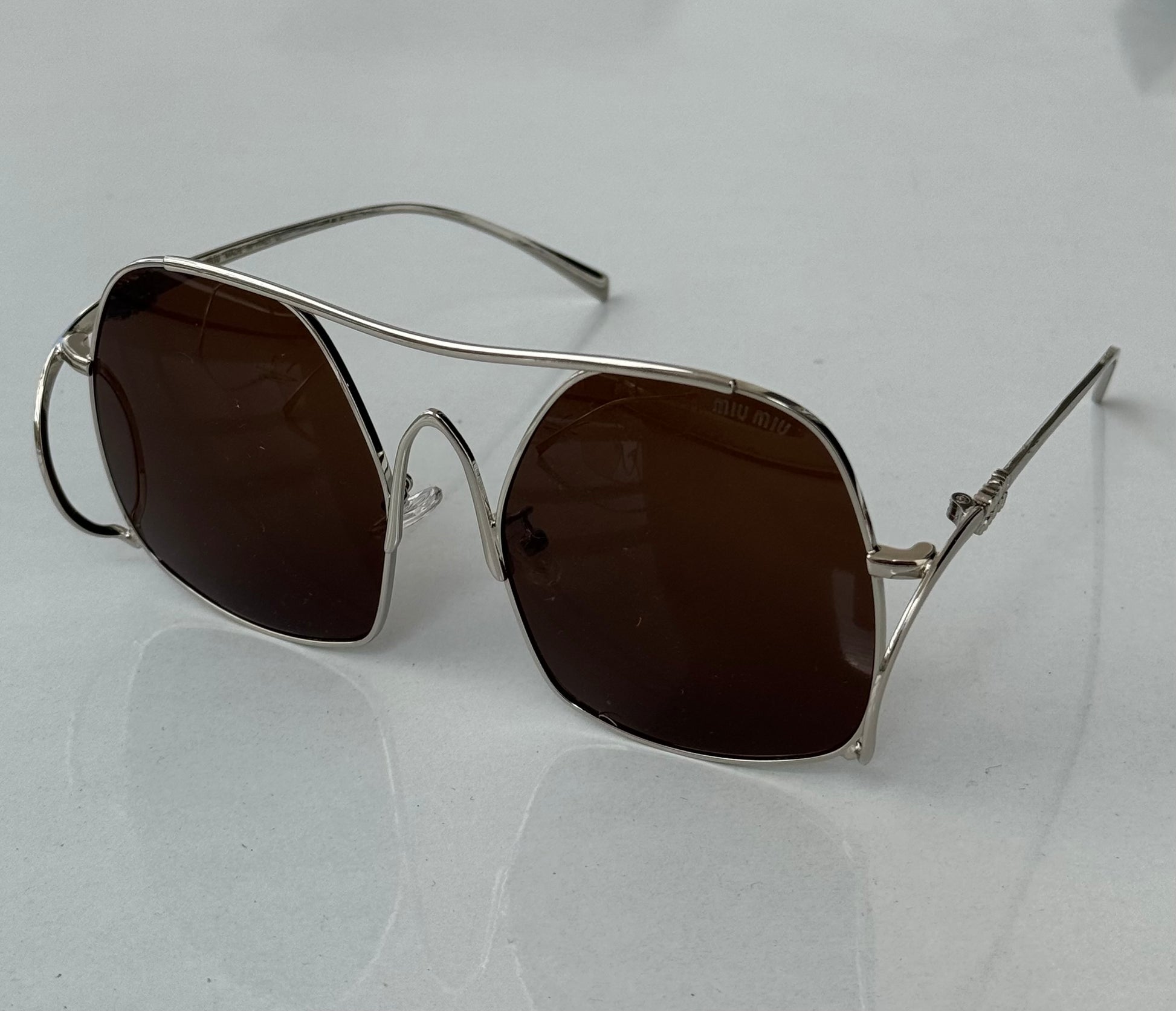 Sinuous lines and refined details define these Miu Ombre sunglasses for Spring/Summer 2025. The oversized metal frame has square lenses highlighted by the strong design of the double bridge. The temples are decorated with the Miu Miu logo in a contrasting gold or silver finish.