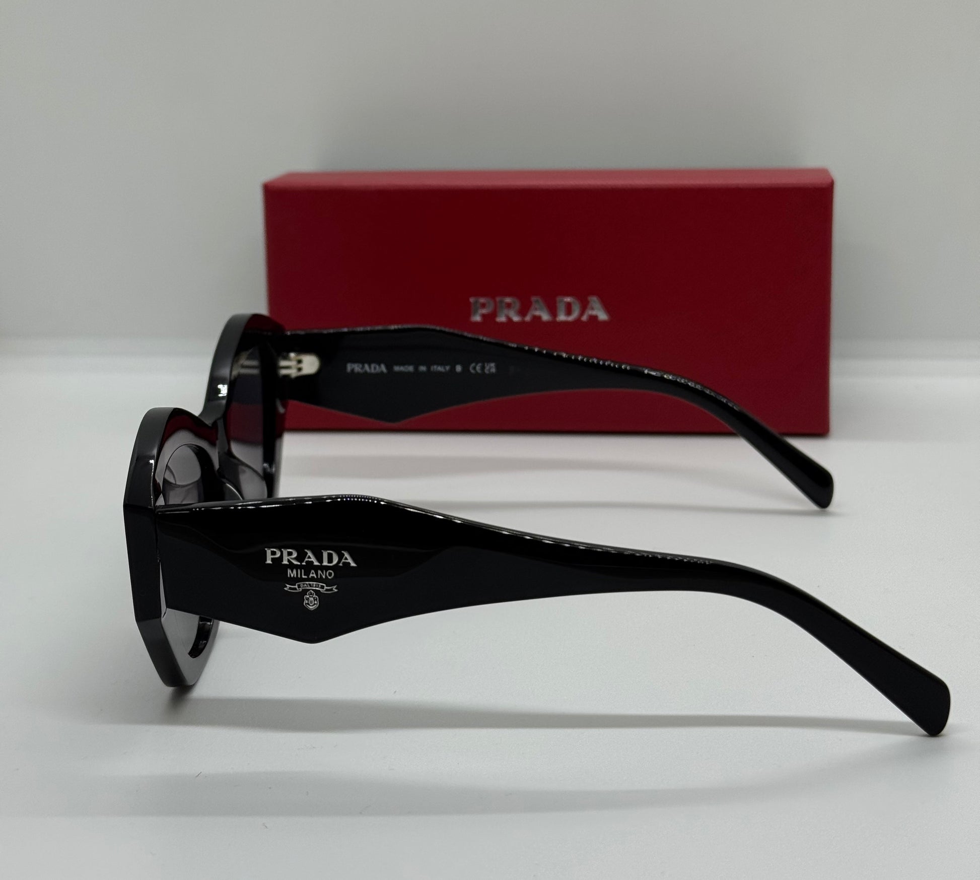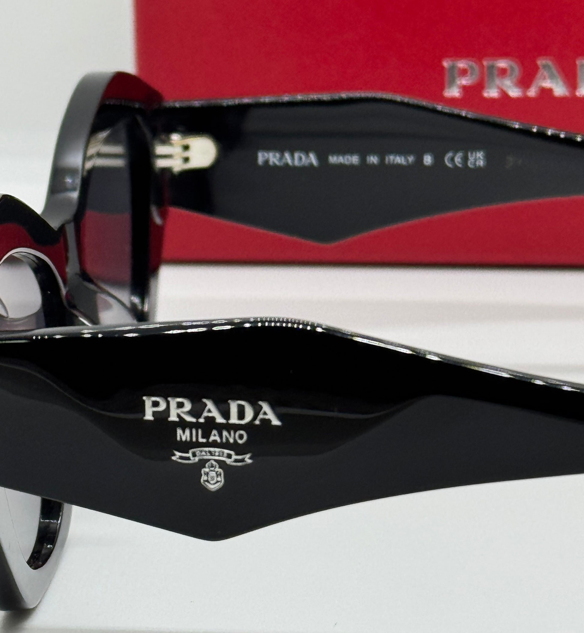 - Distinguishing Features: They include thick, sculpted temples (arms) adorned with a silver-tone Prada house emblem or logo plaque.